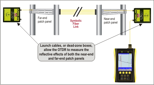 OTDR launch cables, or dead-zone boxes, placed at near-end patch panels allow the OTDRs detector port sufficient time to recover from its blindness. Dead zone boxes also enable the OTDR to measure the relative loss through the near-end and far-end patch panels (see diagram below). Without a sufficiently long launch cable, the reflection from the near-end patch panel will be undetectable because it is within the dead-zone caused by the OTDR port. Likewise, at the far-end, lack of a dead-zone box will prevent the OTDR from measuring the relative loss through the far-end patch panel. In most cases, launch cables that are slightly longer than one kilometer are sufficient to account for dead-zones on nearly all fiber links. However, longer launch cables may be needed for long-haul fiber optic links. |
