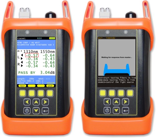 Testing two fibers at a time: 1) saves time by testing both fibers in opposite directions simultaneously; and 2) allows link length measurement with every test. Fiber OWL 7 BIDI certifiers have two dual-fiber test modes: (click the links to learn more about the test modes) PAIR: both fibers in a pair are certified in only one direction Cabling standards only require fibers to be tested in one direction, so PAIR mode is the fastest way to certify fiber pairs according to cabling standards. BIDI: both fibers in a pair are certified at two wavelengths in both directions Bi-directional testing is not required by standards, but many end-users will request BIDI testing anyway. BIDI test mode is the more thorough, but is also more complicated and time consuming. |
