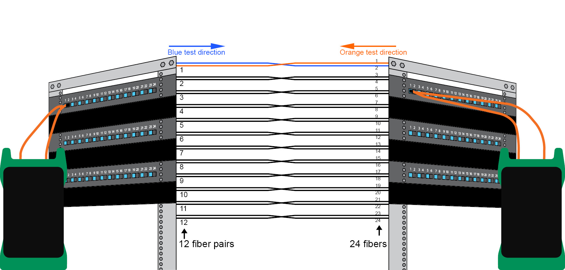 test direction does not matter. PAIR mode is twice as fast as bi-directional link certification and much less confusing. Testing bi-directionally requires a two-step process: test in one direction, swap fiber ports, then test in the other direction. PAIR mode cuts testing time in half by eliminating the second (not required) direction, and keeps things simple by eliminating the often-confusing and error-prone step of swapping fiber ports. PAIR mode is twice as fast as traditional link certification. Traditional link certification certifies one fiber at a time. PAIR mode tests two fibers at a time, significantly speeding up the certification process. In addition, PAIR mode allows length measurement with each test, something that traditional link certification cannot do. The Link Wizard in the Fiber OWL 7 uses attenuation parameters from popular cabling standards to certify fiber links, and shows complete PASS/FAIL test results for both fibers at both wavelengths, all on the same screen, right in the field. |