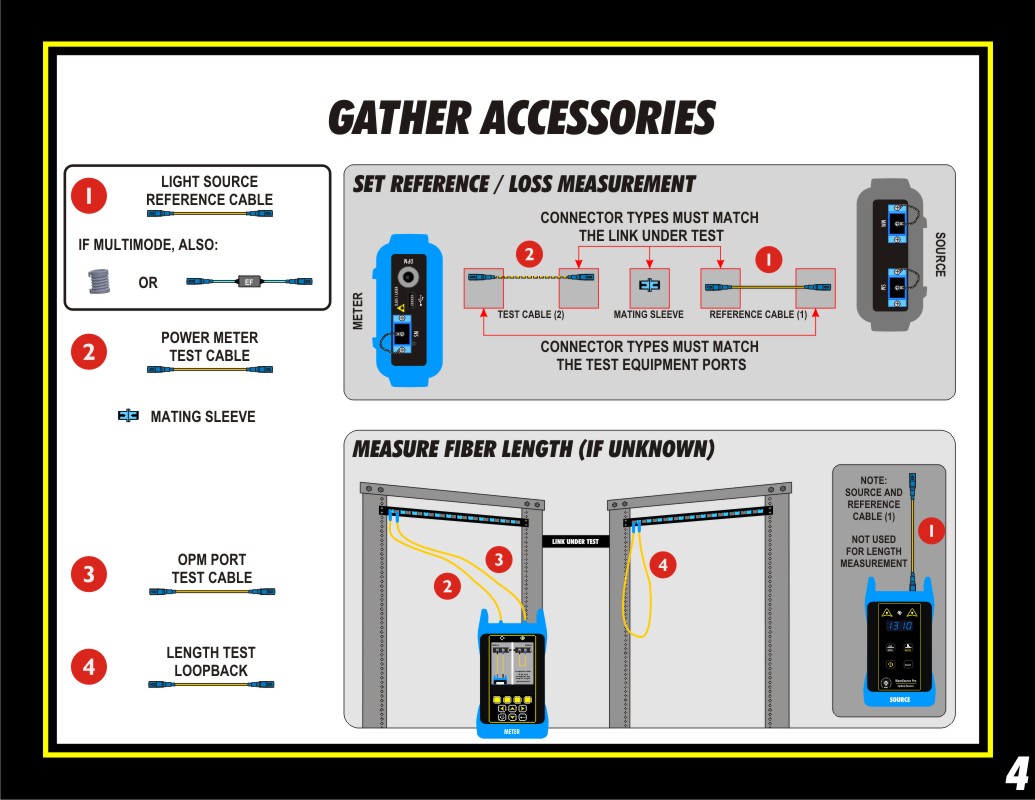 First, the patch cables must be the same fiber type as the link under test. If the fiber length is already known, you will need 2 test cables. If you need the meter to measure the length, you will need 4 test cables.