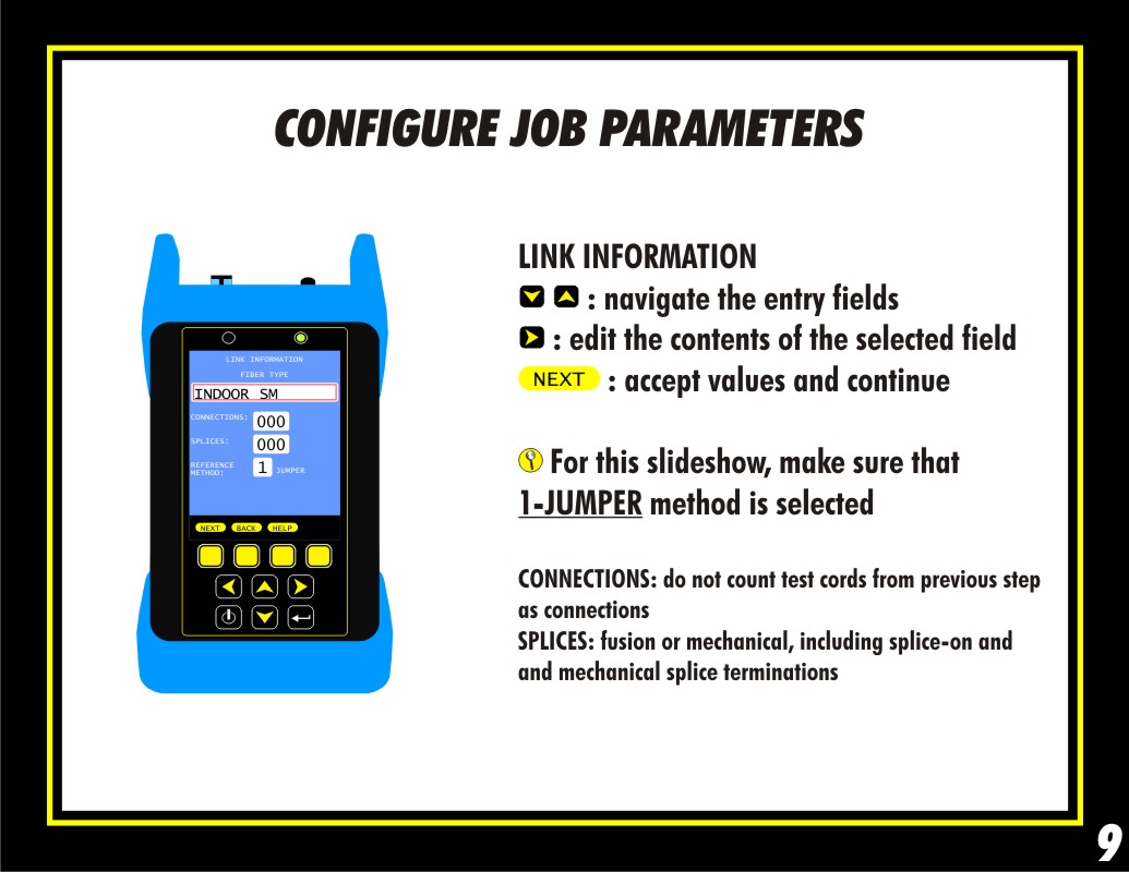So, when entering the number of connections in this step, only count the connections that are in the middle of the link. This number will be 0 in most cases, unless testing through multiple cross-connected segments or consolidation points.