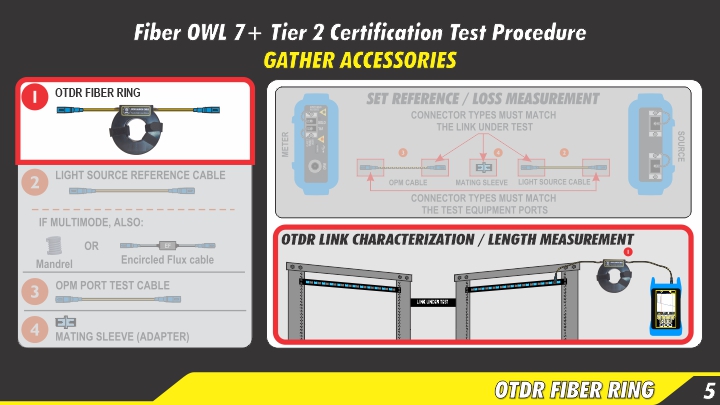 The next step is to gather the necessary accessories to perform the test. The diagram is numbered to show the various accessories. All of the test cables must be the same fiber type and core size (in the case of multimode) of the fiber under test. Then determine the appropriate connector configuration: Cable #1: The “OTDR” end of the fiber ring must be LC and the other end of the fiber ring must match the connector type in the link under test. |