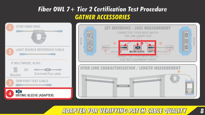 Because the power meter cable does not get “zeroed out”, it is included in the loss measurement. So to verify how much loss this cable introduces into the loss measurement, use an adapter (aka mating sleeve, bulkhead, coupler) to connect the power meter cable to the light source reference cable right after the “zeroing” procedure. |