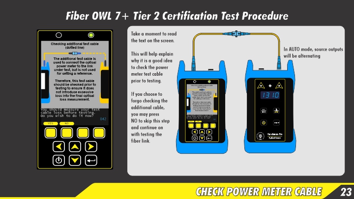 Once the references have been set, the user is given the opportunity to check the power meter test cable. The meter will display a short explanation about checking the additional test cable. Press YES to check the cable, or press NO to skip this step. |