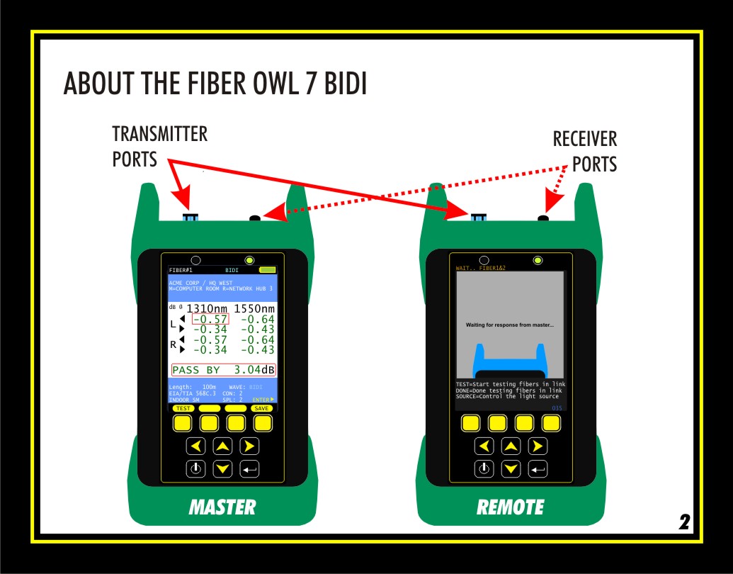 The Fiber OWL 7 BIDI fiber certifier is a matched set of two optical loss test sets, or OLTS, called master and remote.