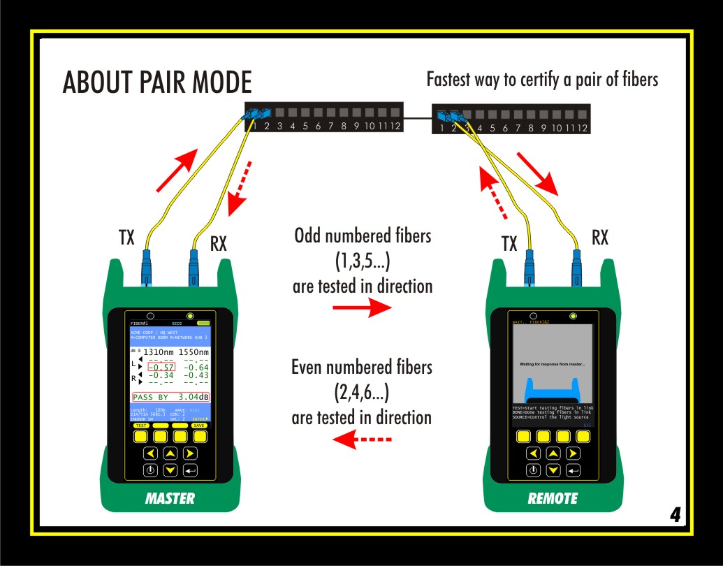 By taking advantage of dual-fiber testing, PAIR MODE is the fastest way to certify a pair of fibers simultaneously, since industry cabling standards such as the TIA-568 only require fibers to be tested in one direction. In other words, the direction of the test really doesn't matter.
