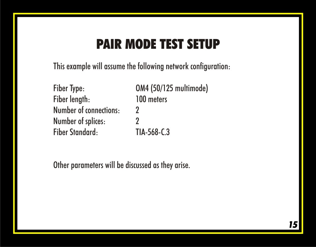 The following sample demonstration will assume the technician is using the TIA-568-C.3 cabling standard to certify an OM4 multimode fiber backbone with a fiber length of 100 meters, 2 patch panels, 0 mid-span connections, and 2 mechanical splice-on connectors. Other parameters will be discussed as they arise.