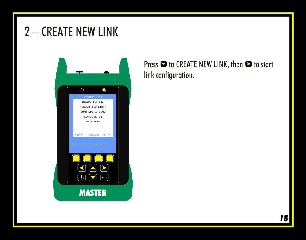 From the STARTUP MENU, press the down arrow to highlight the CREATE NEW LINK menu option, then press the right arrow to start the link configuration.