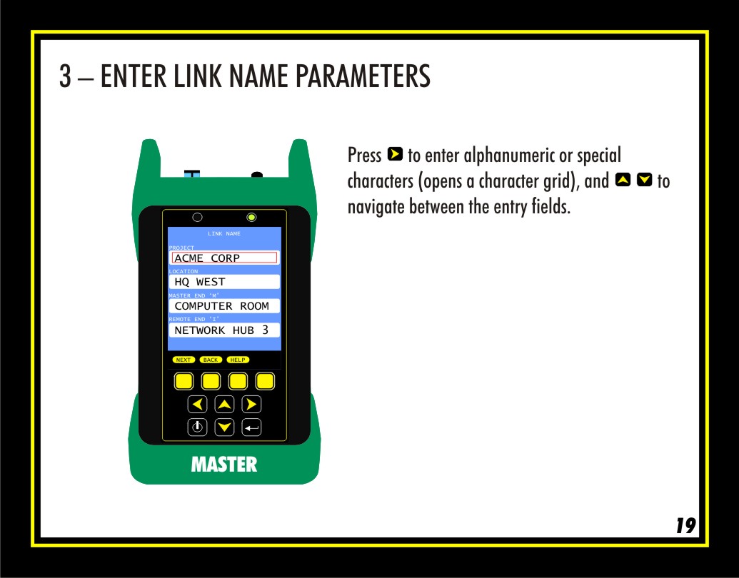 MASTER END and REMOTE END designate where the MASTER and REMOTE will be used during the test. This information is important for jobs where the direction is important (such as in bi-directional testing), but for PAIR MODE this information is more helpful than critical. In this demonstration, the MASTER will be used in the COMPUTER ROOM, and the REMOTE will be used in the room called NETWORK HUB 3.