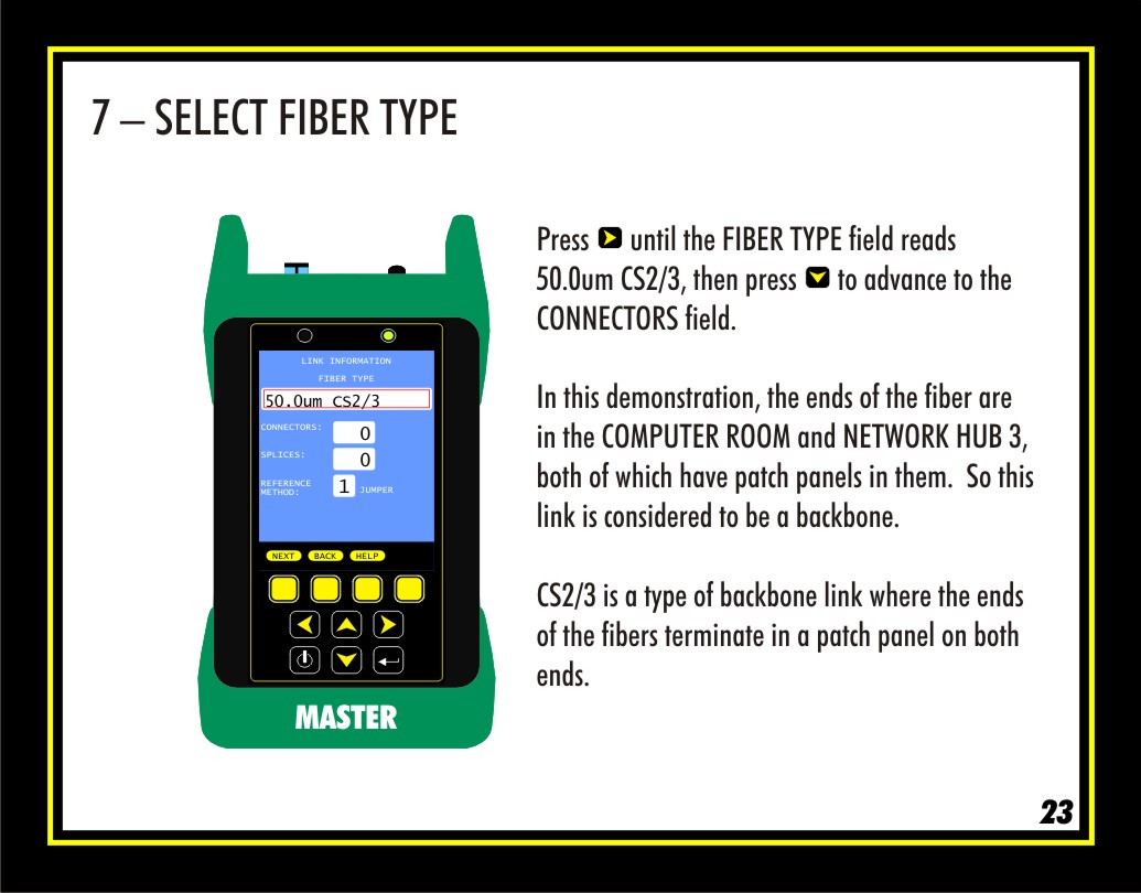So, press the right arrow key until the FIBER TYPE field reads 50.0um CS2/3, then press the down arrow to advance to the CONNECTORS field.