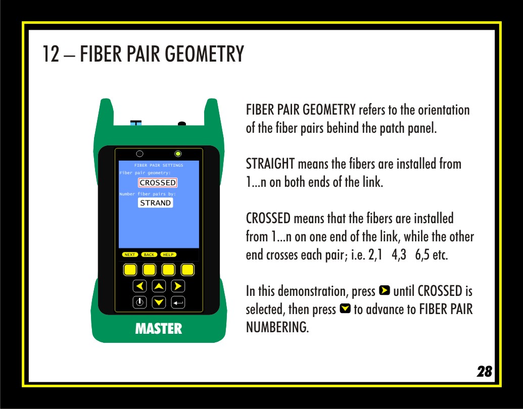 The CROSSED setting will display diagrams on both the MASTER and REMOTE that prompt the user to connect the test cords straight in to the fiber pairs. This will become apparent later on in the slideshow.