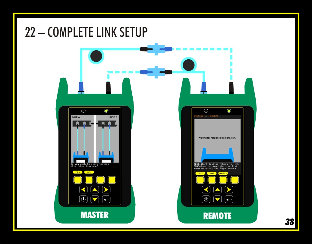 You will notice that new diagrams will appear on the MASTER and REMOTE units. These diagrams show the user how to connect in to the first fiber pair to test.